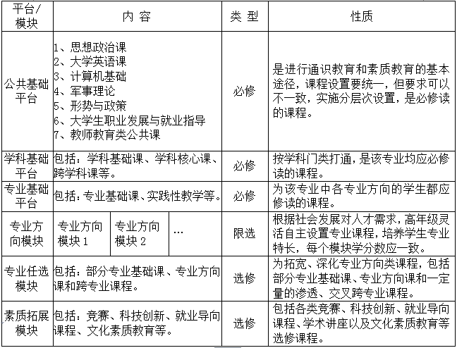 1、公共基础平台:是对员工进行通识教育和素质教育的基本途径。主要包括思想政治理论课、大学英语、计算机基础等课程以及教师教育类公共课。是全校各专业必修课,由全校统一安排。