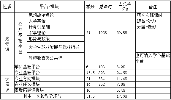 体育教育专业本科毕业课程总学分一般为:160—190学分。人才培养方案中列入教学计划中的各类平台课程的学分、学时、占总学时的总体要求如下表: